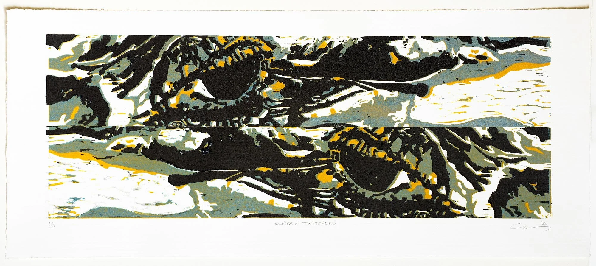 The Curtain Twitchers / 2020 Woodcut: Reduction (12" x 27.5")